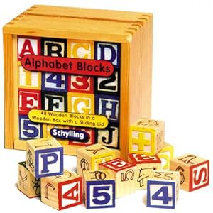 These painted wooden alphabet blocks are a true classic, the kind of toy that stays around from one grateful generation to the next. Each 1.25-inch cube is stamped with letters, numbers, and objects. Kids will spend hours at a time with these blocks, building, creating, and "writing." Regular playtime with them can heighten letter, number, and object identification skills, and illustrate how placing one letter next to another and another can make a word. On two sides of each block the letters or numbers are slightly raised and painted in cheerful red, blue, green, or yellow, with a border for emphasis. In addition to all the letters of the alphabet and numbers 0 through 9, there are four symbol blocks with a question mark and the plus, minus, and equal signs. The depicted objects include stylized stars, eyeglasses, flowers, trains, and bees. A nifty (and convenient) wooden box with a sliding lid keeps the 48 blocks in one place. --Emilie Coulter