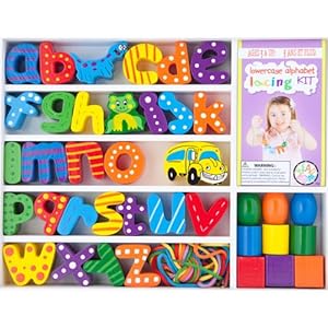 - The alphabet lacing kit for small hands from Bead Bazaar includes large colorful wooden beads, charms and lacing strings